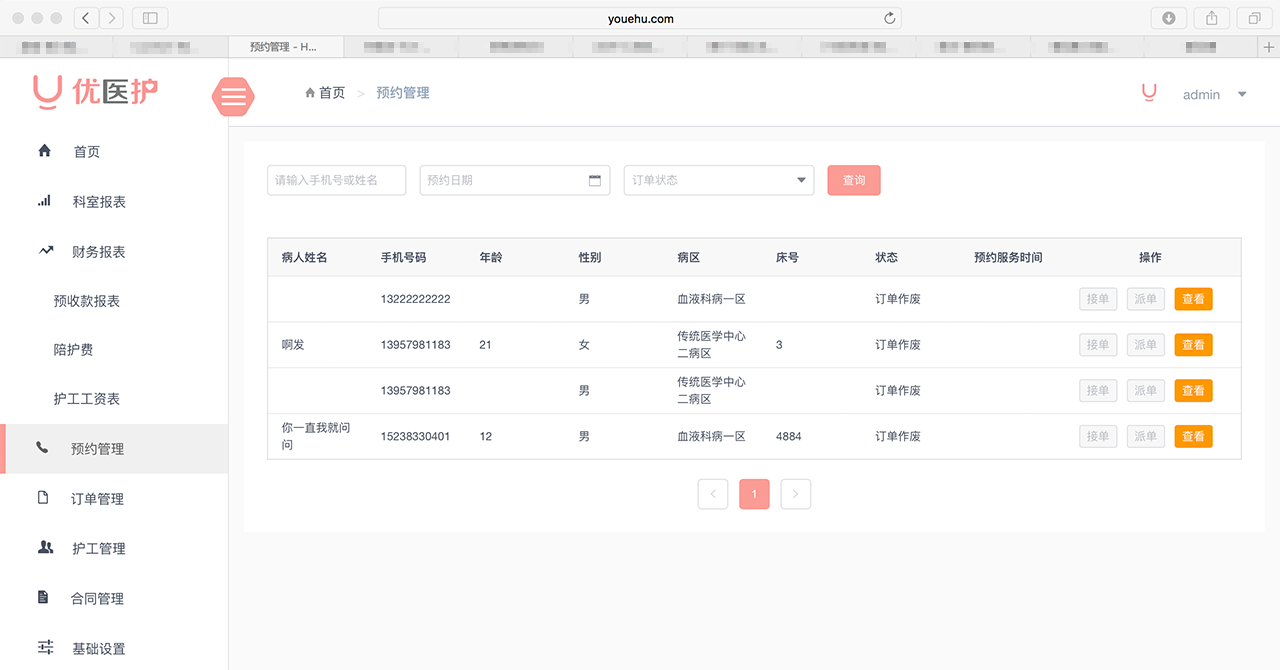 管理(lǐ)人(rén)員(yuán)通σα×>(tōng)過優醫(yī)護平台,快(kuài∏§¶)速處理(lǐ)用(yòng)戶預約需求↔♠©,并且可(kě)以實時(shí)對(duγ≥ ì)所有(yǒu)訂單進行(xíng)有(yǒu≠δ)效管理(lǐ)。